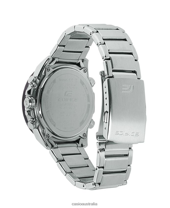 Smartphone Link | A digital/analog combination model from the EDIFICE smartphone link series. A sporty design that uses a red accent color on a black base color. A multi-function model that displays various forms of information in an easy-to-understand way via an LCD in addition to the needle pointer hand. Displays the time with split second accuracy by linking to smartphones via Bluetooth, and is equipped with world time, which allows wearers to easily choose from approximately 300 cities. The large inner dial on the 4 o'clock side is a speed indicator. When measuring lap times, a sign indicating average speed is displayed based on set distances. Equipped with a fully automatic LED light that illuminates the dial and liquid crystal display with a simple tilt of the wrist to ensure visibility at night.