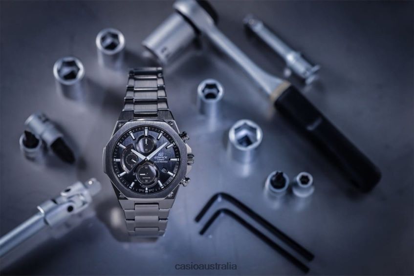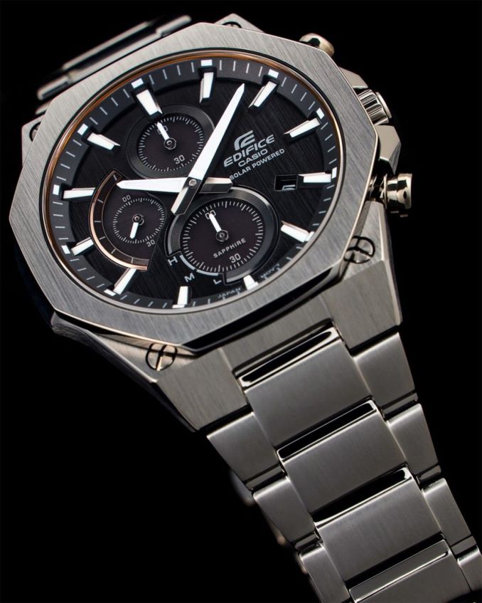 Slim Solar Powered Chronograph with Sapphire Crystal | Although multi-hand chronograph cases tend to be thick, this is a solar powered chronograph with a case kept to a thickness of 9.7 mm to provide an enhanced fit. The watch boasts a flat octagonal bezel with a hairline finish that creates a sporty yet luxurious design. Uses a scratch-resistant sapphire crystal. The combination of a case and band given a black ion plate for scratch-resistance and a red accent color creates a bold design.