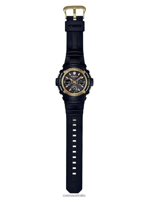 Popular digital-analog AWGM100 design. Whenever the analog hands interfere with reading of the digital display, simply press a button and the hands move out of the way for a clear view. Metal embedded in the resin of the band enables light weight along with plenty of strength.