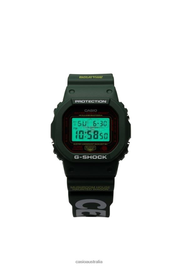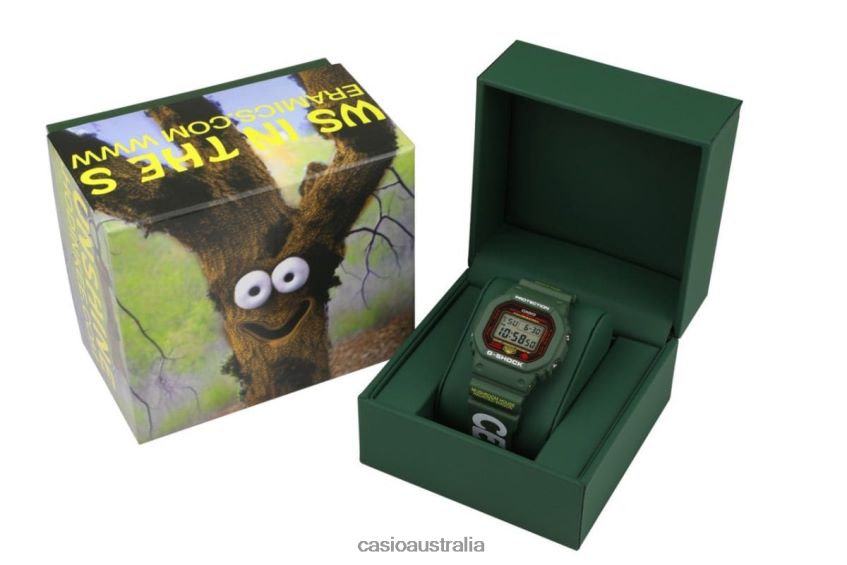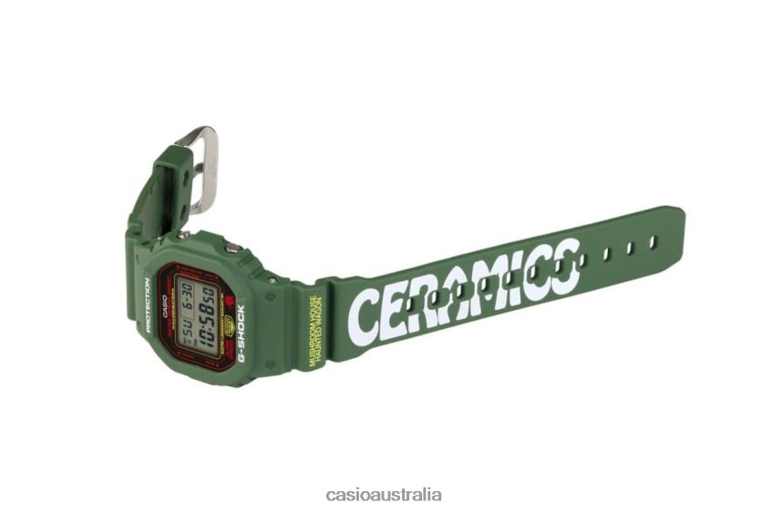 Beloved for their Dead & Co T-shirt designs, Online Ceramic was founded in 2016 by Elijah Funk and Alix Ross, and is well-known in the music scene for its unique approach to graphic design. The brand has developed a cult following for playful, trippy, and often tie-dyed designs. Now, the brand is adding a twist to the G-Shock 5600 with its distinct design style, to offer a lighthearted and playful take on the classic timepiece.Online Ceramics' take on the timepiece comes in a deep forest green, with the strap emblazoned with "Online Ceramics" in a psychedelic font as well as a screen surrounded by yellow, red, and orange accents and Online Ceramics' snail logo. Framing the face, bright yellow text reads "Sun Watch, Moon Time" and "Mushroom House Haunted Wagon," further solidifying the vibe that feels like a walk into some very strange woods. As a final easter egg, when the wearer presses the button for the backlight a special phrase is revealed on screen that reads "Love Grows In The Sunshine." This light and wearable watch doesn't sacrifice functionality or hard-wearing intent, and has a resin case and strap, mineral glass covering the screen, and 200 meters of water resistance.