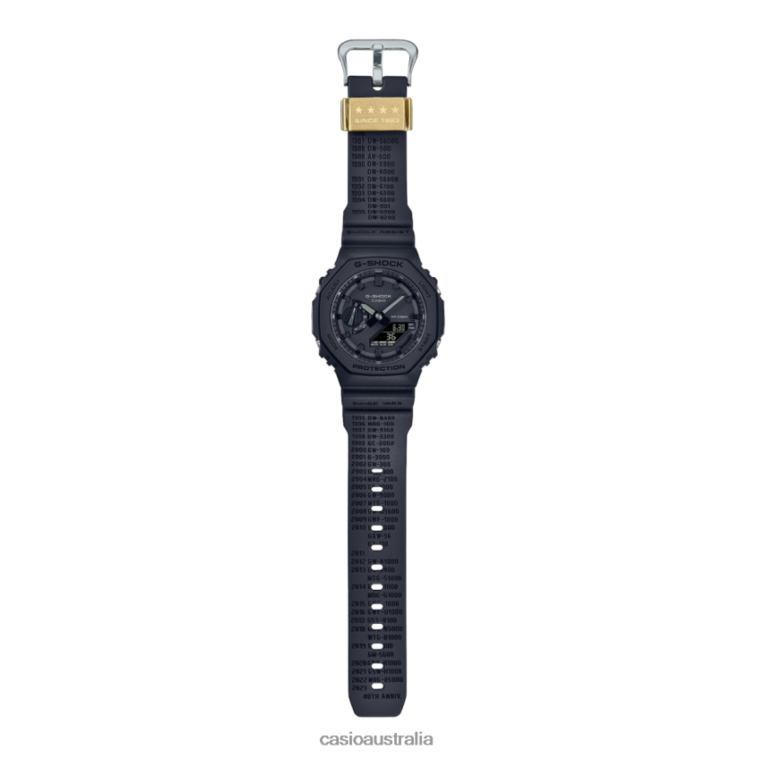 Join the 40th anniversary celebrations marking G-SHOCK milestones with a selection of signature revivals in solid, time-tested all-black.In homage to the brand's evolution, these special designs memorialize iconic models from the past with their names hot-stamped on the band to textural, indented effect. On the DWE5657, DW6640, and GA2140, a side button is engraved with a star in a nod to the 40th anniversary.The band and bezel of every model in the line are made with bio-based resins. The 40th anniversary logo designed by Eric Haze is engraved on the case back, and also appears in silhouette when the light button is pressed on the DWE5657 and DW6640. With four stars for 40 engraved on the band loop and other special details, these limited-edition timepieces are heirs to G-SHOCK history.