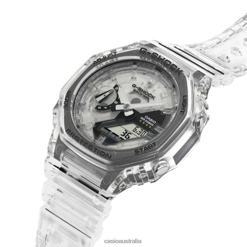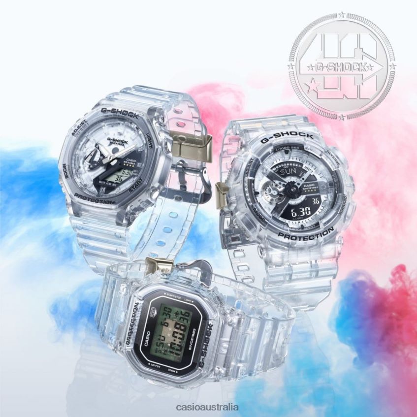 Express yourself in no uncertain terms with the G-SHOCK 40th anniversary Clear Remix lineup - popular G-SHOCK designs deconstructed with see-through components for the clearest look yet.See-through materials for the band, case, dial, LCD, and buttons provide a behind-the-scenes view of the module substrate printed with the G mark and G-SHOCK logo. The case back features the Eric Haze-designed 40th logo, and the band loop is engraved with four stars in a nod to this special anniversary. These details and the first-ever use of a see-through case made of clear glass fiber diamide deliver a singular design worthy of an exceptional limited-edition G-SHOCK. The new lineup includes watches modeled after multiple iconic G-SHOCK timepieces: the very first G-SHOCK, the DW-5000; the classic digital DW-5600; the DW-6900 with distinctive front button design; or the GA-2100/GMA-S2100 or the GA-110/GMA-S110, which can be worn on their own or as part of a matching set.See-through case: DW-6940RX, GA-114RX, GMA-S114RXSee-through dial: DW-6940RX, GA-114RX, GMA-S114RX, GA-2140RX, GMA-S2140RXSee-through LCD*: DW-5040RX, DWE-5640RX, DW-6940RXSee-through buttons: GA-114RX, GMA-S114RX*The digital display may be difficult to read at certain viewing angles due to the see-through materials used for the LCD.