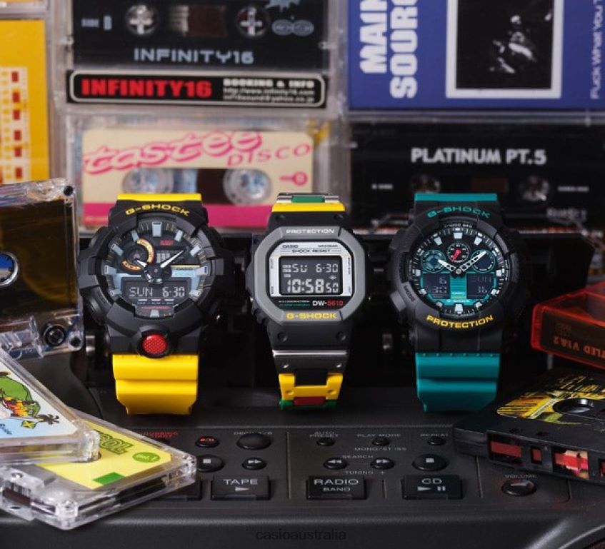 Step back to a time when mix tapes were the ultimate, with a G-SHOCK inspired by colorful cassette labels.Vibrant red, yellow, green and black evoke the cassette tape - a fond memory for those who lived it and now a brand-new discovery for a new generation - for a line of classic analog-digital timepieces that are as eye-catching as they are nostalgic.Choose your favorite - the classic digital DW5610, the GA100 with large case, or the GA700 with front button design.
