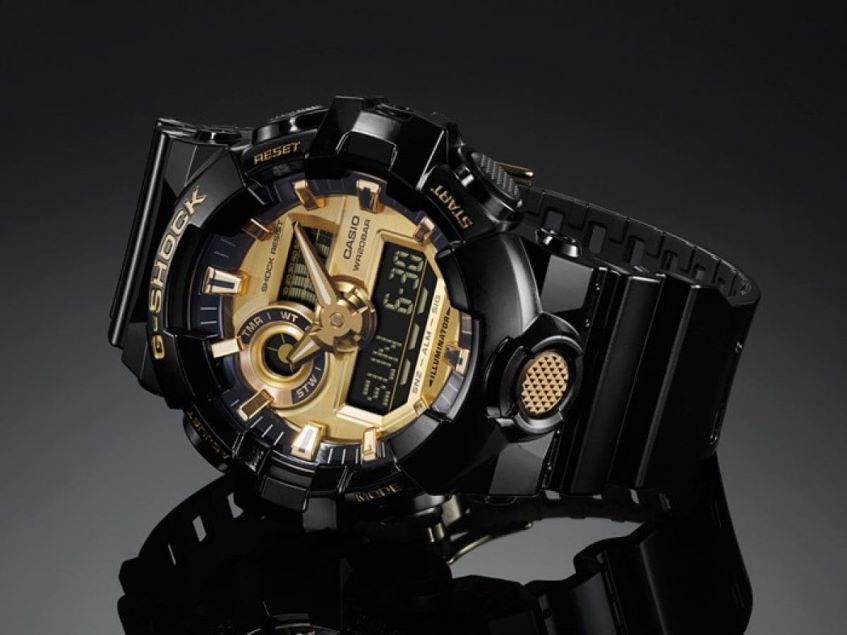 A model with garish colors from G-SHOCK, which continues to evolve in the pursuit of toughness. Uses as the base model the GA-700, with three-dimensional hour and minute hands and powerful indices created using a unique resin-molding technology. A lineup of black and gold models reminiscent of accessories and fashion items that b-boys might wear. The whole body has a glossy finish, giving it a tough, energetic style. A model with colors the look great with street fashion based on a standard GA-700 G-SHOCK model.