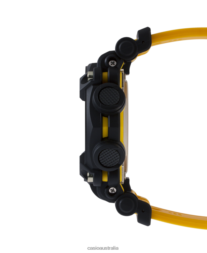 A heavy-duty model that can be used in tough environments as well as for street fashion. The nut-like 10-sided bezel is fastened with screws to express the industrial design motif, and is finished in a rugged, tough, and straightforward design. The use of analog hands with a digital display also enhances usability. High visibility is achieved, even in the powerful face, by inserting graphics on the hands and dial. Additionally, the lug ends of the band and all the function buttons, including the front button, are engraved with non-slip checkering for excellent operability. A yellow resin band is used to express the CMF (Color Materials Finish) design.