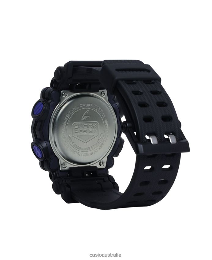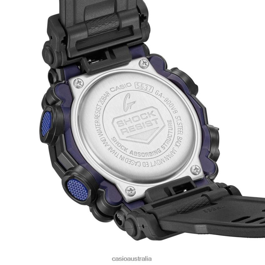 The analog-digital GA900VB-1A takes a dive into the world of virtual reality. The basic black coloring of the watch is accented by blue violet, which creates a futuristic atmosphere of virtual reality for the rugged, big case GA900.