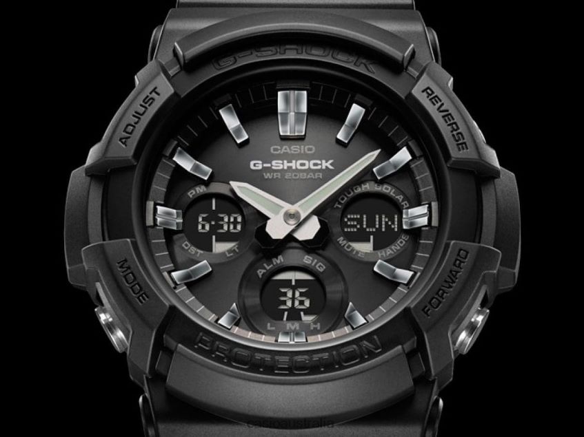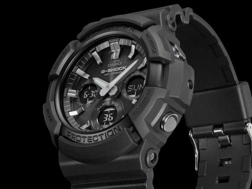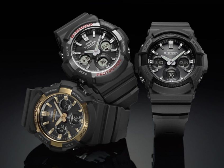 From G-SHOCK, the watch brand that is constantly setting new standards for timekeeping toughness, come new models based on the big case Tough SolarGAS-100. Variations on a basic black design are created by three different bezels. The GAS-100 comes with a stainless steel bezel for a standard design that goes well with a wide range of fashion styles, while the GAS-100G has a stainless steel bezel with a gold ion-plated finish for touch of distinctive beauty. The GAS-100B has a black aluminum bezel for a cool design.A CASIO original molding process is used to produce deposition coated hour markers that combine with the metal bezels to create a look of elegance. Tough Solar Hand shift feature Super Illuminator (double) illuminates the face and digital display