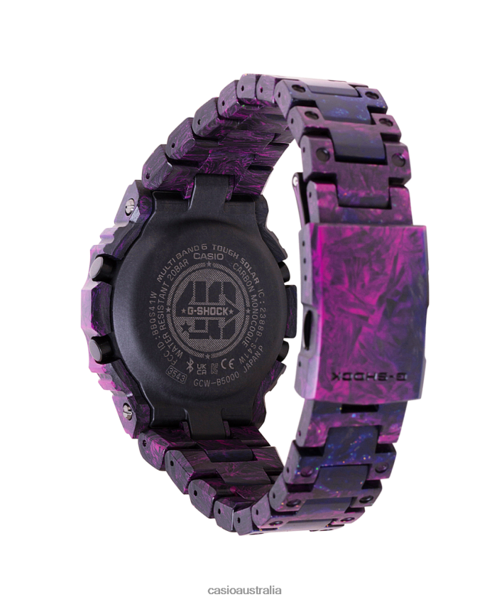 Make a bold statement of strength and celebrate the quest for ultimate toughness with the limited-edition G-SHOCK 40th Anniversary Carbon Edition.The evolution of the G-SHOCK since the debut of the very first DW5000 is a story of constantly advancing functionality, performance, and materials - all while staying true to the beloved design of the original. The 40th Anniversary Carbon Edition takes up this quest with three different carbon materials used for the bezel, the band, and the monocoque case.The bezel and band are made of forged carbon, which can be molded into complex shapes. The clasp's folding arm is made of multilayer carbon, which boasts a high degree of longitudinal bending strength. The carbon monocoque case is made with carbon fiber-reinforced resin. Passionate attention is paid to the specific characteristics of each material produced with a certain technique. The right material is selected for each component, taking advantage of carbon's lightness and high rigidity to create a strong, lightweight, comfortable timepiece.Inspired by the unique textural look of the forged carbon used for the bezel and band, the color schemes evoke the Milky Way's magnificent band of hazy light. Two color options are offered: the GCWB5000UN-1 is clad in a pattern of mixed black and grey, while the GCWB5000UN-6 combines black carbon fiber with blue and pink coloured resin and opal specks for a mysterious appearance.This innovative style delivers full-on functionality, as well. Download the dedicated app to pair with your smartphone via Bluetooth . With Multiband 6 radio control for automatic precision timekeeping, Tough Solar charging system, high-brightness full auto LED backlight, world time, day display in six languages, and scratch-resistant sapphire crystal, this timepiece keeps you at peak performance.The carbon monocoque case, engraved with the logo designed by Eric Haze to commemorate the 40th anniversary, adds the final touch to an incomparable limited-edition celebration of G-SHOCK.Due to the characteristics of forged carbon, which is a mixture of carbon fiber and resin, the pattern, color tone, and distribution of opal powder on the surface of each part (bezel, band, and clasp) varies from model to model.*Opal powder is not included in the clasp.