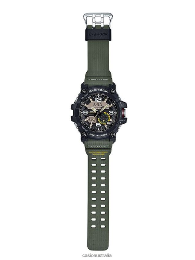 This is a Twin Sensor model from the G-Shock Mudmaster Series, designed for use in extreme environments scattered with rubble, dirt and debris. With a push of one large button at the 3 o'clock position, you can check your position with its Compass. The temperature can also be measured easily by pushing the button at 4 o'clock. This model has been developed with operability in mind so that anyone can intuitively check their position using the Compass, even in the most extreme climates, without visual observation. The dust and mud-resistant button guard cylinder structure prevents fine sand and mud from getting into the buttons while also helping to absorb any shock to the buttons and improving operability. Broad hour/minute hands and indices of large Arabic numerals have also been adopted to improve visibility. This design is packed with military-style flare, including a mode display that uses a sprocket-inspired disk dial and a textured band to prevent slipping.