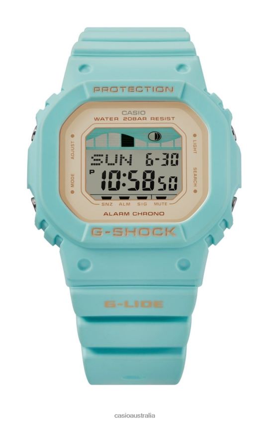 Introducing a more compact G-LIDE sports watch with tide graph displayfortably compact and slim, this design also takes its cue from nature. The bezel and band are made with eco-friendly biomass plastics using renewable organic resources to reduce environmental impact. Eco-friendly and functional, these watches deliver the tide graphs and moon data needed to ride the waves around the world, directly to the surfer's wrist.