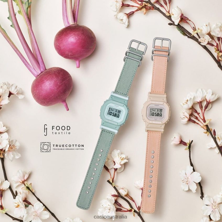 Introducing G-SHOCK timepieces as nature-minded as you, made with renewable materials and a focus on sustainability.We begin with the iconic shape of the GMD-S5600, but in a smaller, slimmer design. Then, we make the key resin components with bio-based resin produced from renewable organic resources, which are expected to help curb CO2 emissions and reduce environmental impact.We take the focus on nature to the next level with very special cloth bands that feature the work of two innovators - TRUECOTTON and FOOD TEXTILE - to reduce waste and promote ethical sourcing.The cloth for the bands is made of traceable organic TRUECOTTON so we know which farm and spinning mill it comes from. This not only helps manage environmental impact, but also ensures workers are protected and craftsmanship is high quality throughout the production process.The bands are colored with dyes from FOOD TEXTILE, a project to reuse food that would otherwise be discarded to create natural dyes. Soft, earthy colors are brought to life with dyes made with over 90% natural ingredients. The gentle blue grey hue of the GMD-S5600CT-3 band is achieved with a dye extracted from red turnip, while the GMD-S5600CT-4 band is colored with a dye extracted from sakura cherry blossoms, for a soft pearl pink color.Materials that had been destined for the trash are reborn in a beautiful new form - a sustainable, environmentally friendly watch.