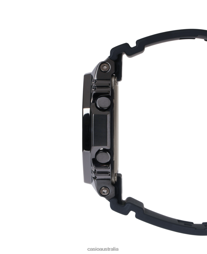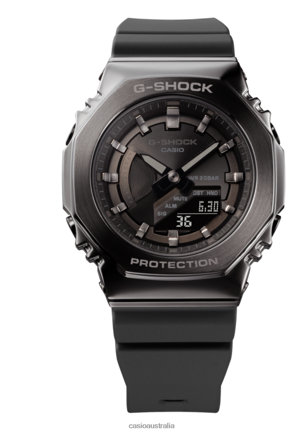 Go slim, clean and bold with a mid-sized black resin band GMS2100B-8A in a metal-clad octagonal take on the original iconic design.Forged in stainless steel with rounded hairline finish, the strong dark gray bezel says super style all the way. Only the lettering at the top and bottom are engraved, for a simple, one-piece design. The dial, flattened for slimness, is treated with ion plating color and mirrored indexes to add shimmery depth.