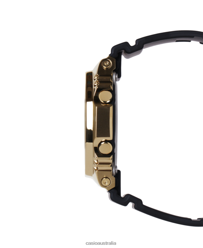 Go metal-clad with a gold-on-black G-SHOCK in a smaller, more compact profile.Finished in gold ion plating, the metal bezel says elegant luxe all the way. Buttons and buckle, also ion-plated in gold, are set against a black for a contrast that makes the metal truly shine.The luxury of gold paired with the strength of black in a shimmery beauty that is uniquely you.