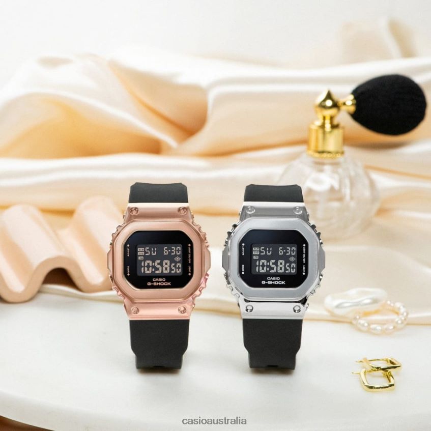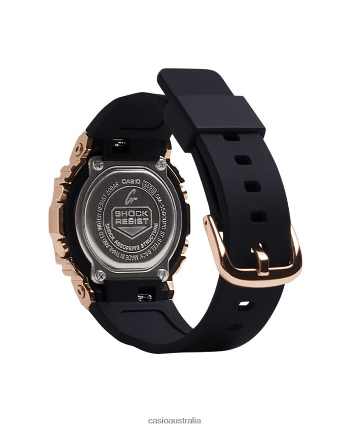 A down-sized model of the iconic 5600 series with a metal finish. The square design of the GM-5600, which has been used since the first model, has been downsized to achieve a lightweight and comfortable fit. The bezel cover is made of metal with pink gold ion plating, and the band is an elegant G-SHOCK band in black.
