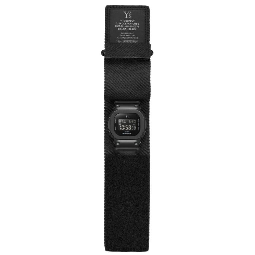 The GM-S5600YS-1 is a collaboration between G-SHOCK, which continues its unending quest for the ultimate toughness, and Y's, the first brand launched by world-renowned designer Yohji Yamamoto.Marking the 50th anniversary of its 1972 launch this year, Y's is a brand that crafts high-quality fashion with universal values and unique pattern-making techniques.The GM-S5600YS-1 begins with the GM-S5600, the more compact version of the iconic octagonal G-SHOCK that features a metal bezel. This timepiece comes with an additional custom-made cloth band that can be swapped with the resin band to suit the mood and style of the day. For added functionality, the cloth band includes a cover to protect the watch face. The cover can be pulled back, folded through the buckle, and easily fastened in place with Velcro. The woven label listing model number and watch functions is sewn at the top edge of the cloth band as a graphic design element inspired by the woven label sewn into Y's brand clothing. Like the Y's line, this band is also carefully designed to be durable and comfortable to wear.The all-black body carries on the Y's style and is accented with metal components for a refined look. Each part of the timepiece is carefully polished with a different finish - the buckle and case with a honing finish; the bezel top with a hairline finish; and the side buttons and screws with a mirror finish. The dial and case back feature the Y's logo.Y'sY's is designer Yohji Yamamoto's very first brand, and to this day it bears his vision and philosophy. The concept at the root of the brand is women wearing men's clothing, and Y's creates pieces for independent women who value their own timeless vision. Each piece of functional, refined everyday wear in the brand's unique clothing category is shaped by universal values and unique pattern-making techniques. The brand values the importance of "the space between the garment and the body" to emphasize airiness, volume, and balance, employing careful cutting and meticulous selection of materials to achieve a refined silhouette. The Atelier team that carries on the Yamamoto philosophy continues to present Y's unique brand identity: functional, elegant, pret-a-porter daily wear.