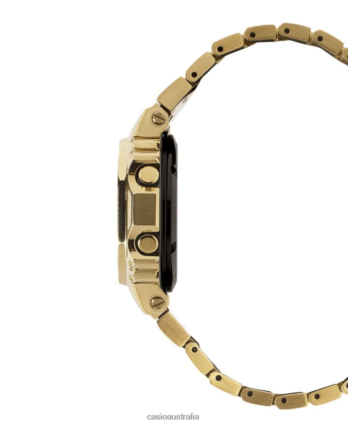 The DW-5000C is the original G-Shock model from 1983. The GMW-B5000 Series has inherited its characteristic square design and been given the full metal treatment along with upgraded features including smartphone linking. The GMW-B5000-1JF has been given a full-metal case by using a shock-resistant fine resin cushioning material inserted between the case and the sturdy stainless steel metal bezel. High-density mounting technology also allows the watch to maintain its size. The back of the watch features a solid Screw Lock Back and has been DLC treated for resistance to wear. Gold ion plating has been applied to the entire case and band for a beautiful color. Visibility too has been enhanced via use of a film solar cell and STN-LCD (liquid crystal). Function-wise, this model comes with Bluetooth communications and can link with a dedicated app to obtain precise time information. The watch is also packed with practical features including a time correction system that uses standard time and frequency signals (Multi-Band 6), a reliable source of power in the form of Tough Solar technology, high-luminance Full Auto LED backlighting, World Time and day of the week display in six languages. This is a G-Shock model that stays true to its predecessor while undergoing further refinement through the application of a full-metal design.