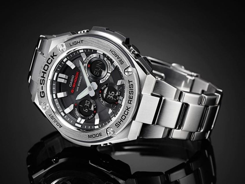 rom G-SHOCK, the watch brand that is constantly setting new standards for timekeeping toughness, comes G-STEEL, a watch series with a new layer guard structure.Different materials are used for the bezel to create a two-layer structure that adds a new dimension of shock resistant. For models that use stainless steel in the upper part, shock absorbing resin is employed in the lower part. If resin is used in the upper part, fine resin is used in the lower part to cushion against impact from the upper part. This also has made it possible create a wide range of different designs.The GST-S110 model expresses the hardness and beauty of metal.A hand shift feature temporarily moves hands out of the way with the press of a button for easy reading of digital display contents, while double LED face illumination keeps information easy to read at all times.