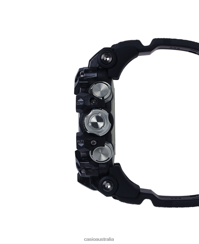 Take on the toughest terrain with the G-SHOCK MUDMASTER GWG2000-1A1, designed to handle the harshest, roughest on-land environments.This shock-resistant watch is constructed to withstand all the mud and sand your adventures may bring, and it leverages our latest exterior technology to deliver a smaller profile with an even better fit.This compact design is made possible by the forged carbon bezel, carbon core guard case structure, and mud-resist buttons combined with stainless steel pipes and silicone buffers. Finely powdered carbon fiber is kneaded into resin, then heat-pressed to mold a bezel that is more complex, yet even stronger than before.Triple sensor measurements keep you updated with direction, altitude, barometric pressure, and temperature readings. Large Arabic numeral indexes, extra-thick arrow-shaped hands, double LED lights, and sapphire glass ensure high visibility. The band is textured in the style of heavy-duty no-slip rubber grips, and the buttons are knurled for easy operation. A MUDMASTER designed for practicality, durability, and power.