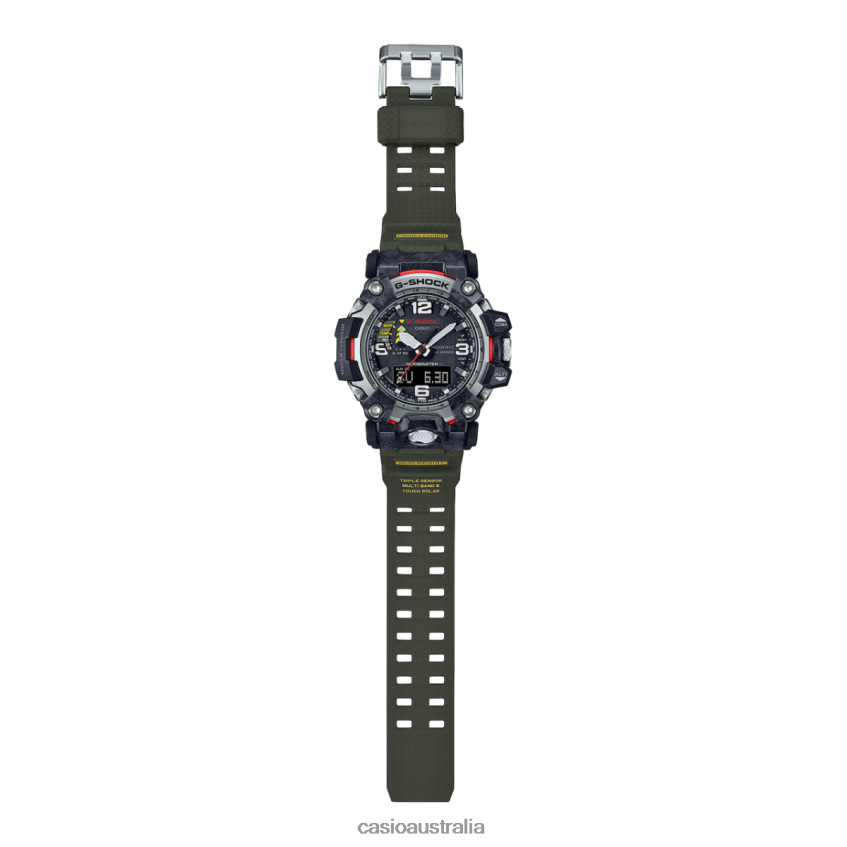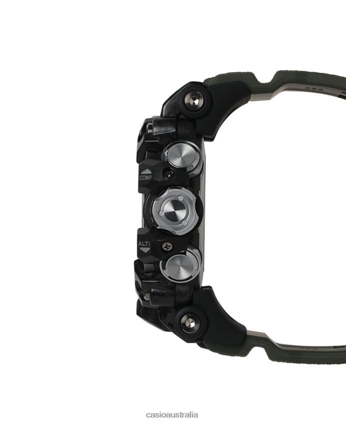 Take on the toughest terrain with the G-SHOCK MUDMASTER GWG2000-1A3, designed to handle the harshest, roughest on-land environments.This shock-resistant watch is constructed to withstand all the mud and sand your adventures may bring, and it leverages our latest exterior technology to deliver a smaller profile with an even better fit.This compact design is made possible by the forged carbon bezel, carbon core guard case structure, and mud-resist buttons combined with stainless steel pipes and silicone buffers. Finely powdered carbon fiber is kneaded into resin, then heat-pressed to mold a bezel that is more complex, yet even stronger than before.Triple sensor measurements keep you updated with direction, altitude, barometric pressure, and temperature readings. Large Arabic numeral indexes, extra-thick arrow-shaped hands, double LED lights, and sapphire glass ensure high visibility. The band is textured in the style of heavy-duty no-slip rubber grips, and the buttons are knurled for easy operation. A MUDMASTER designed for practicality, durability, and power.