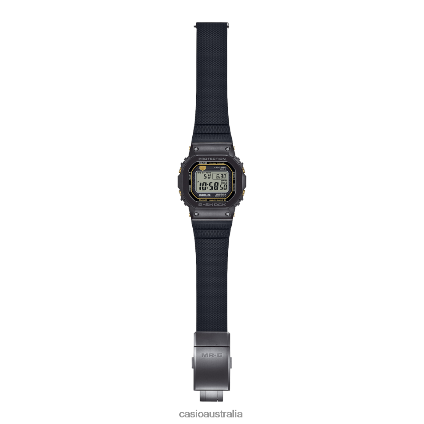 Introducing the MRGB5000, based on the first-ever G-SHOCK and crafted with the state-of-the-art metals and meticulous finishes that are the hallmark of the MR-G flagship line. A study in metal craftsmanship, this breakthrough timepiece features case and bezel components made with the super-hard titanium alloy, Ti64. The bezel top is fashioned from COBARION, an alloy that is four times harder than pure titanium and a brilliant gleam comparable to platinum. The bezel alone consists of 25 different components, each individually polished for a stunning detailed texture. The Multi-Guard Structure incorporates flat springs and silicone buffers to ensure outstanding shock absorption for this multi-component bezel, protecting the dedicated MR-G module with a gold-plated retainer plate for the circuit board.In homage to the original DW5000C-1B, one of the color options for the very first G-SHOCK, the dial projects an iconic brick pattern and circular lines in gold color, while the case is finished in a black DLC coating. This design is complemented with an extremely comfortable Dura Soft band made of fluoro rubber, with insert-molding of titanium components that enhance the strength of the band's connection to the case. The top of the band is finished with textured SHOCK RESIST symbols, and the underside echoes the dial's brick pattern.This beautiful watch celebrates the splendor of metal and also delivers when it comes to function, with radio-controlled calibration and smartphone pairing via Bluetooth .*COBARION is a registered trademark of the Iwate Industry Promotion Center and is manufactured exclusively by Eiwa Corporation.