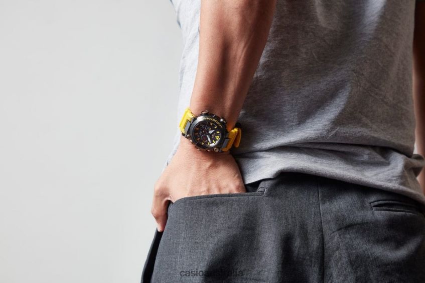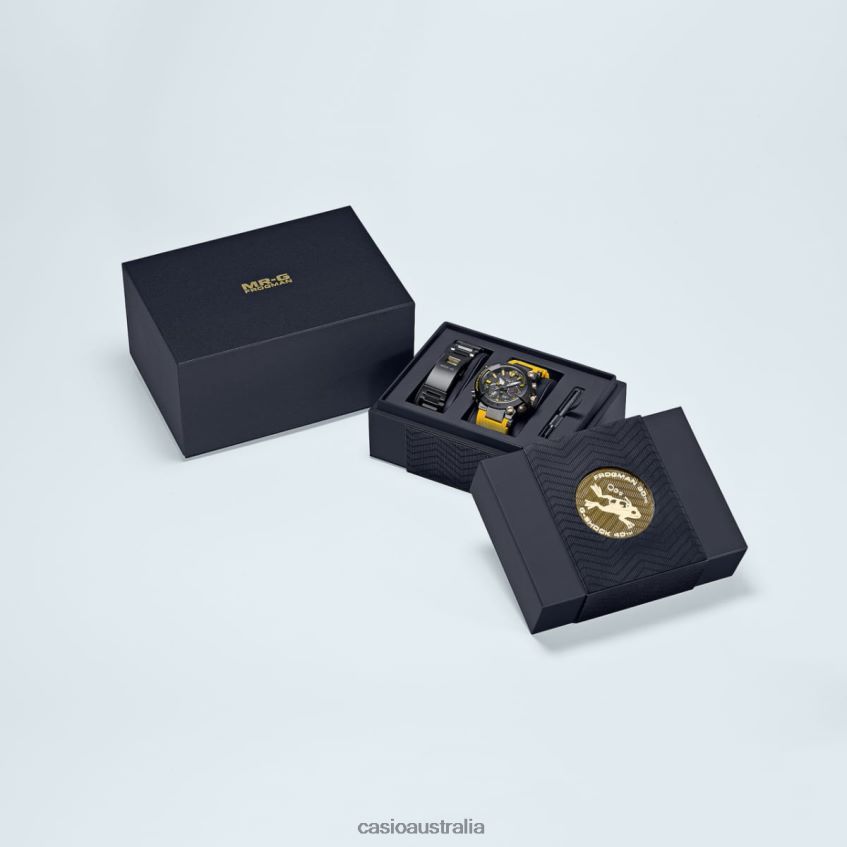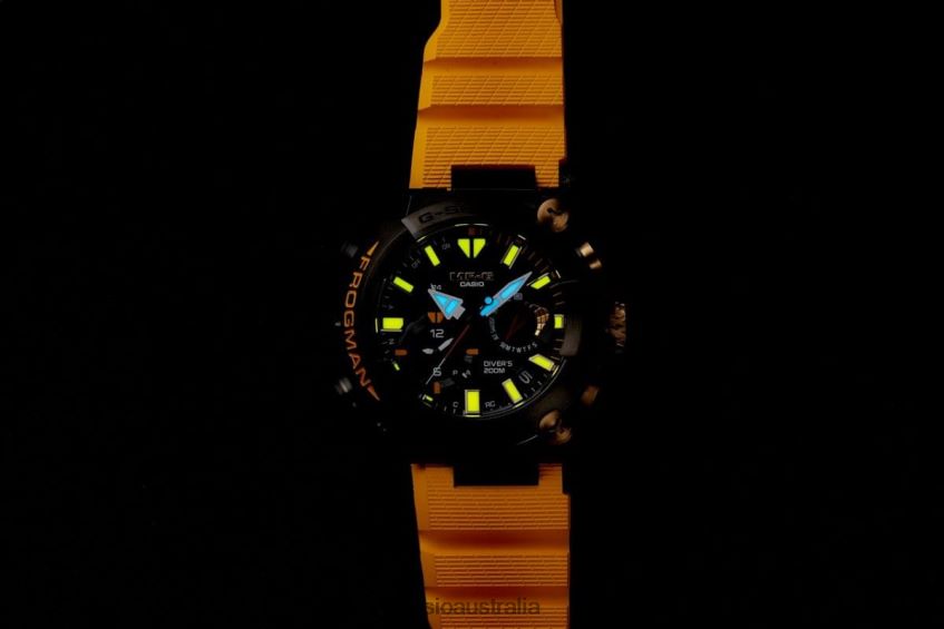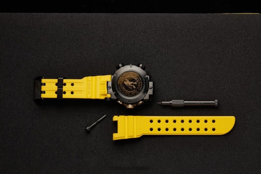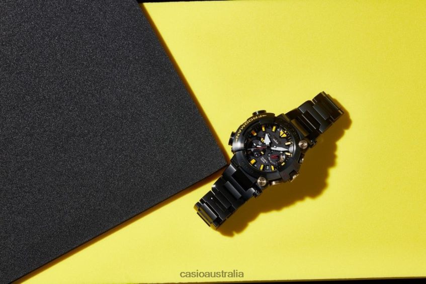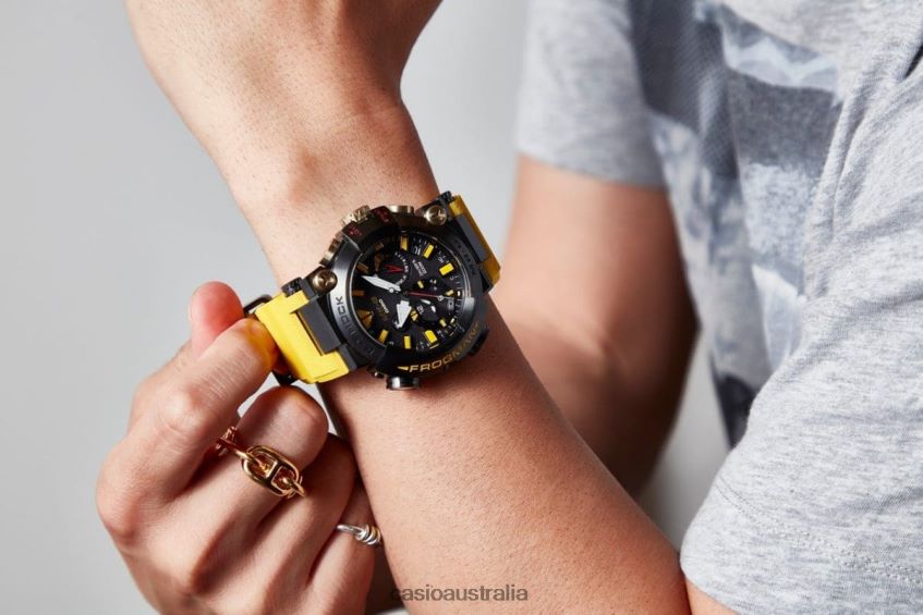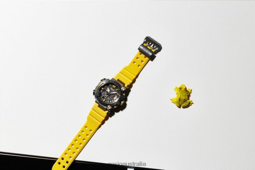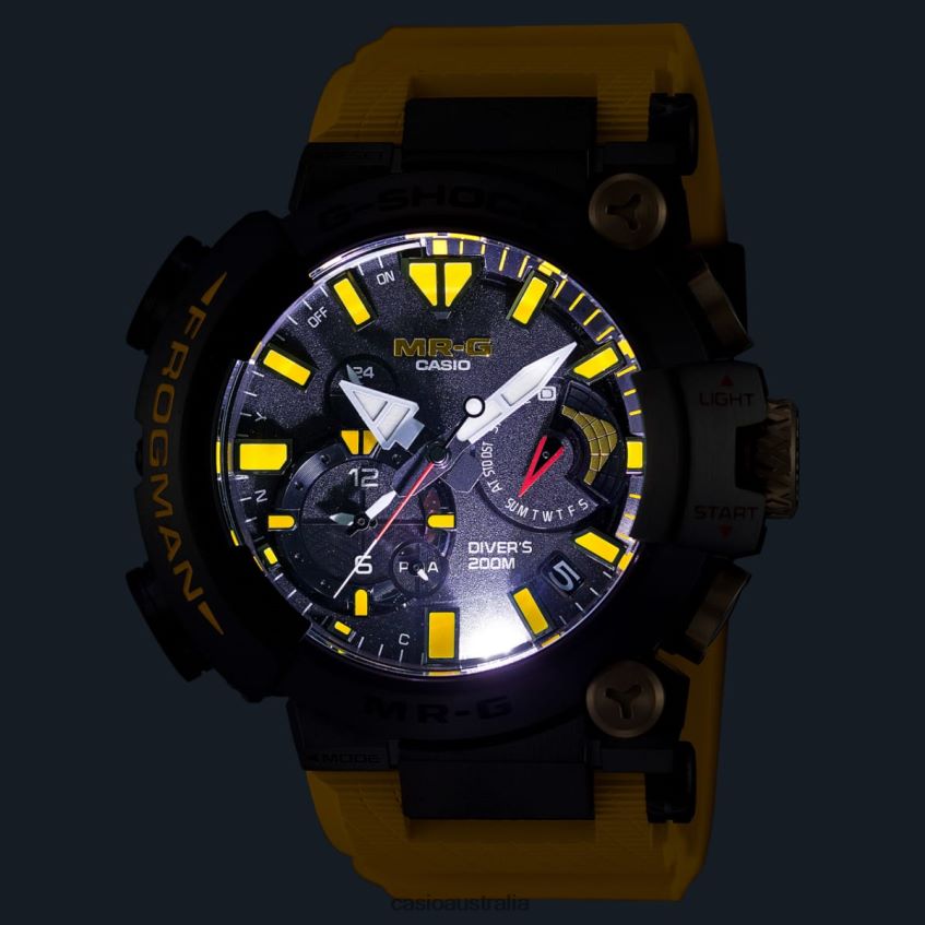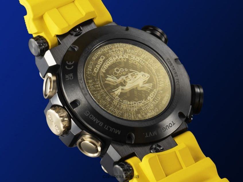 Celebrate two anniversaries in premium style with a limited-edition MR-G FROGMAN that marks the G-SHOCK 40th and the FROGMAN 30th anniversary. The timepiece comes with both a Dura Soft fluoro rubber band in the limited-edition yellow used for the original FROGMAN model and a striking bracelet-type band in titanium. Easily swap out the band using the dedicated mounting tool that comes with the set to remove the side pins while pressing the buttons on the lugs' undersides. Raised index marks are carefully hand-painted with a generous layer of glow-in-the-dark yellow paint for the outstanding visibility you need underwater. The screw-lock case back, fit with sapphire crystal finished in gold vapor deposition, is engraved with the iconic FROGMAN diving frog character.This 30th anniversary model is based on the MRG-BF1000, a premium, full-metal G-SHOCK MR-G timepiece for the sea. Titanium-clad, airtight with ISO 200-meter water resistance, the MRG-BF1000E joins the FROGMAN family of full-fledged diver's watches with meticulous attention to detailed perfection. Its unique asymmetrical design, screw-lock case back and distinctive diving frog character - which were so popular when FROGMAN came out back in 1993 - take the diver's watch to a whole new level.The resin originally used for the complex design of the first FROGMAN is replaced with titanium. Each component is crafted separately and polished meticulously to bring luxe MR-G quality to the FROGMAN line of diver's watches. Pure titanium is treated with a deep-layer hardening process, DLC coating and gold-colored ion plating for even greater strength. An intricate combination of over 70 exterior components, the case includes an O-ring waterproof seal to deliver outstanding FROGMAN water resistance and special buffers to strengthen the shock-resistant structure. For enhanced strength, we've developed a protective structure with fluoro rubber buffers installed between the multiple bezel parts. This structure features face-guarding functionality that helps to absorb shocks from the front and the sides, as well as protecting the crystal - all while maintaining the beauty in form of the MR-G line.