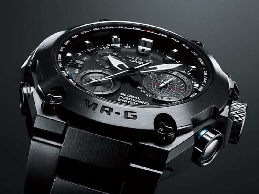 A GPS hybrid radio-controlled, solar-powered model from G-SHOCK's most luxurious line, MR-G. The first watch to be equipped with a shock-resistant structure and GPS hybrid radio solar in a full metal case, it can display accurate time all over the world. Additionally, the clad guard structure makes the crown both operable and impact-resistant, which was previously difficult. The titanium case and band have undergone DLC and deep hardening treatments and are finished in all black to achieve a tight design. Particular attention was also paid to every detail affecting strength and quality, as is reflected in the use of textured polishing, and an anti-reflective coating on the sapphire glass crystal. It is a model that imbues tough men around the world with the pride of MADE IN JAPAN.