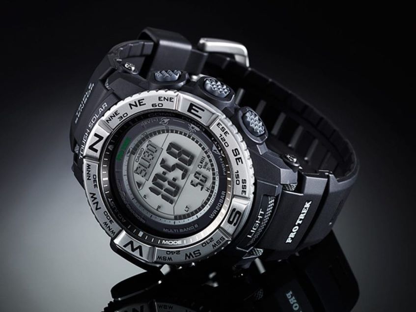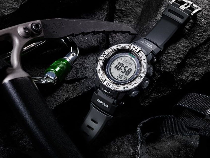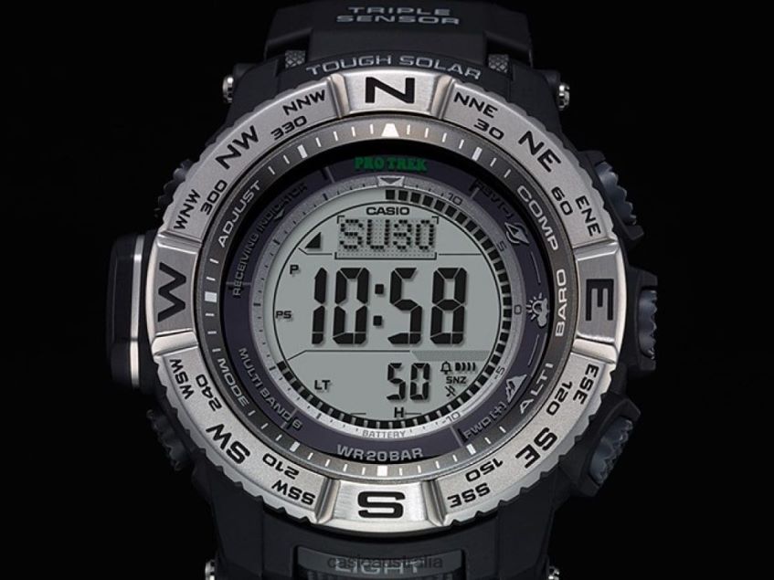 TRIPLE SENSORTriple Sensor Version 3, advanced CASIO original technology that makes it possible to pack sensors 95% smaller than those of previous models into a totally new type of compact PRO TREK. Despite their smaller size, the new sensors in this model provides improved reading accuracy and energy efficiency.This new Triple Sensor Version 3 model delivers altitude, barometric pressure, and direction readings that are more accurate than previous models. A Barometric Pressure Tendency Alarm alerts the wearer to sudden changes in pressure readings, which can indicate upcoming weather events.This model is water resistant up to 200 meters and features Full Auto LED display illumination, which makes it a great choice for wet environments and nighttime operations. A stainless steel rotary bezel can be positioned to help you keep track of your current and intended bearings.In terms of both functions and looks, this Triple Sensor Version 3 provides a choice of outdoor timekeeping gear that can't be beat. MULTIBAND6 reception of six time calibration signals: Japan (2), United States, Germany, England, China Tough Solar ensures stable operation even when using power-hungry functions. Triple Sensor: Compass, Barometer/Thermometer, Altimeter Low temperature resistant(-10oC/14oF)