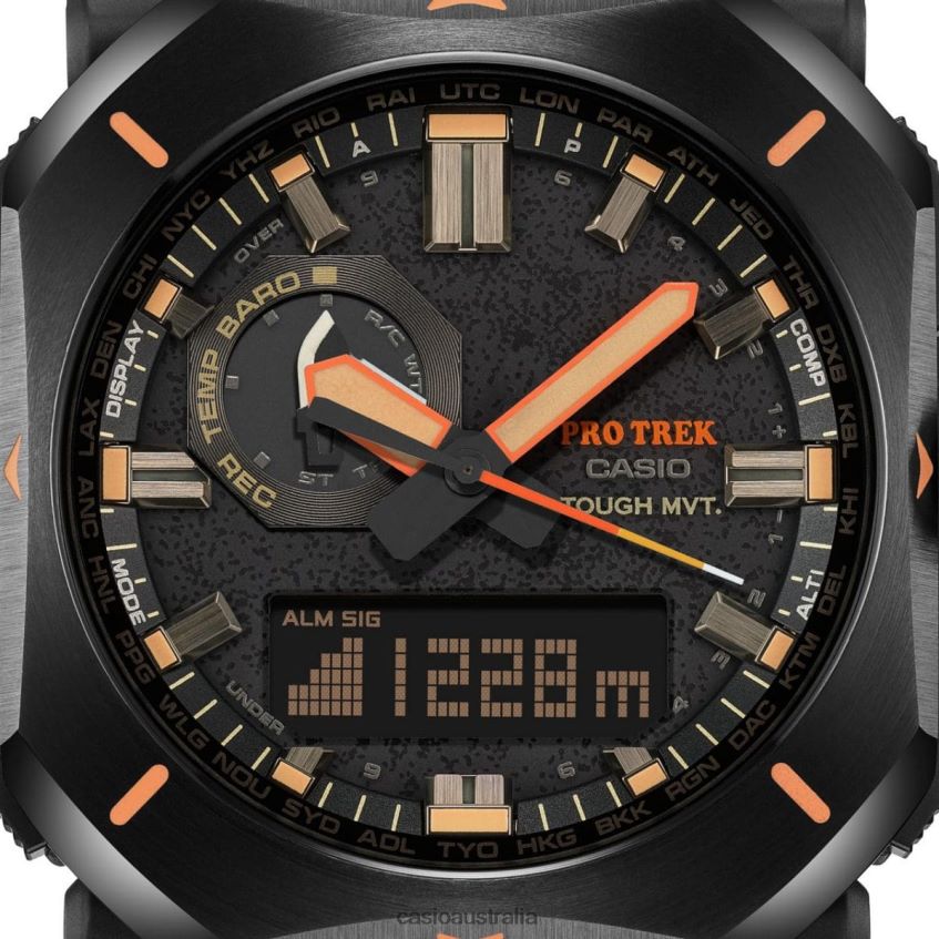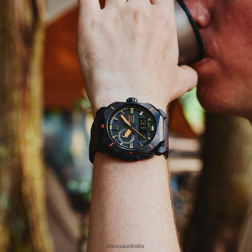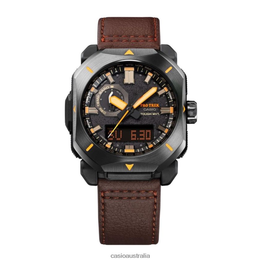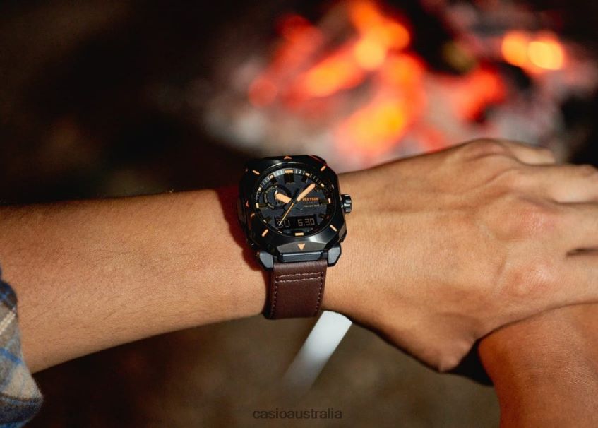 Get out into the great outdoors with a new PRO TREK timepiece featuring solar-powered radio-controlled precision and eco-friendly materials chosen for their environmental performance.The PRO TREK line of authentic outdoor gear for nature lovers now includes the PRW6900YL, a timepiece of solid structural and functional beauty inspired by survival tools.In a rough and rugged outdoor style, this timepiece features a metal bezel with sharply tapered edges reminiscent of a wood axe. At the 10 o'clock position, the inset dial indicator hand recalls the blade of a camping knife, and the second hand features the orange gradation of campfire flames. The base of the dial has a textured cast iron-like surface evoking a Dutch oven, bringing together a design that epitomizes all there is to love about bushcraft.The case and resin case back are made with Bio-based resin, an eco-friendly, green material, in keeping with the PRO TREK commitment to coexisting harmoniously with nature. The newly developed flame-retardant leather band of the PRW6900YL holds up even when hit by flying sparks.