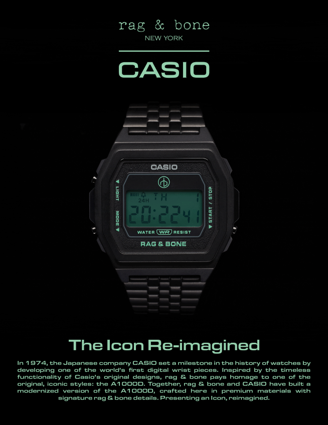 In celebration of the brand's 20th anniversary, rag & bone has partnered with Japanese timepiece brand, CASIO for a line that marries innovative watch design with rag & bone's inimitable brand of downtown cool. The new timepieces, launching Fall 2022, feature a monochromatic band and case, both treated with military accent colors, and a five-row solid metal band that ensures long-lasting comfort.Based on one of CASIO's earliest digital watches, the A1000 has an octagonal case and wears comfortably, with a thin profile. An LCD screen at the face's center displays the time clearly, while also providing space for several additional and useful functions, including the date, a stopwatch, and alarm. All settings are controlled by three convenient buttons on the case sides. This collaboration showcases both brand's commitment to timeless, functional design. (About rag & bone)Since its origins in New York in 2002, rag & bone has established itself as a critical and commercial success in the international fashion world. Combining English heritage with directional design, the brand has become synonymous with innately wearable clothing that has an edgy yet understated New York aesthetic. rag & bone offers a full range of men's and women's ready to wear, denim, accessories and footwear collections.