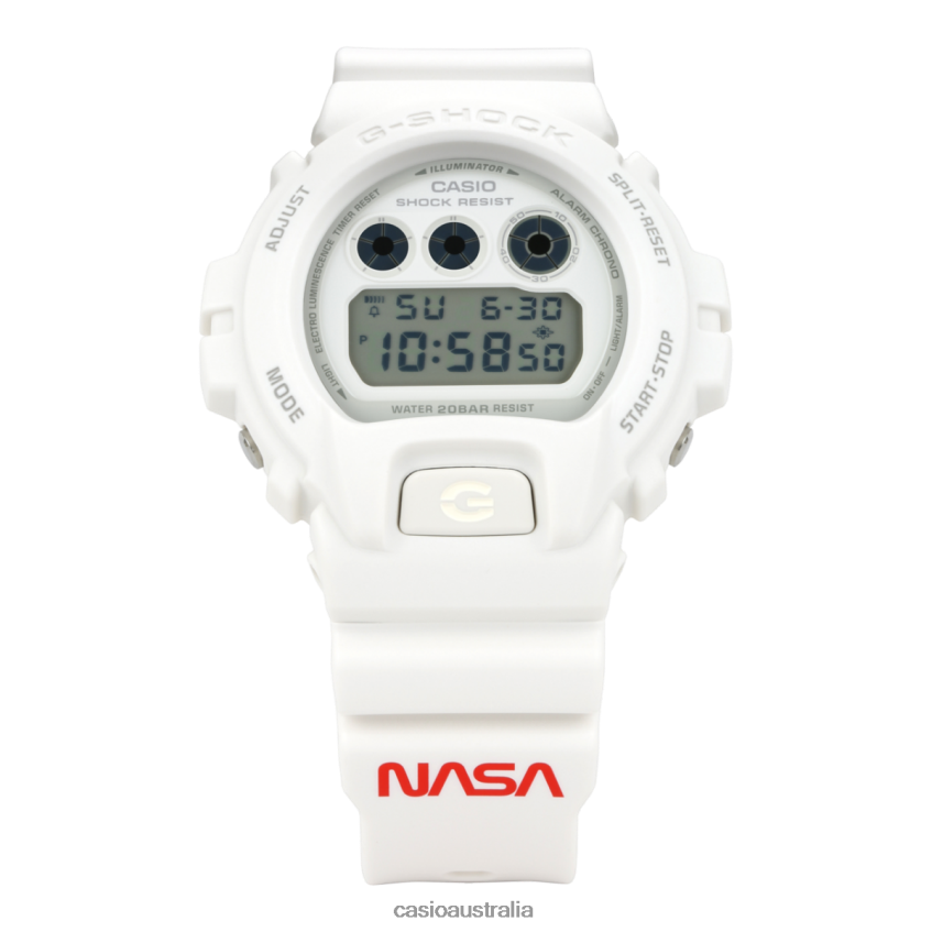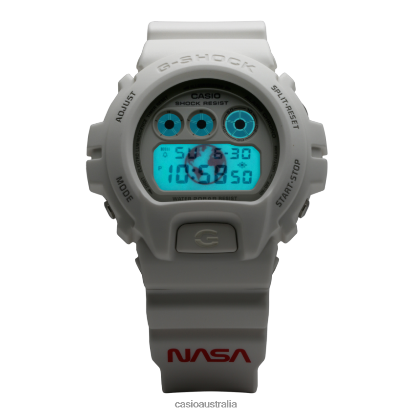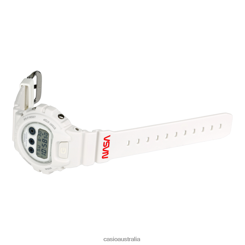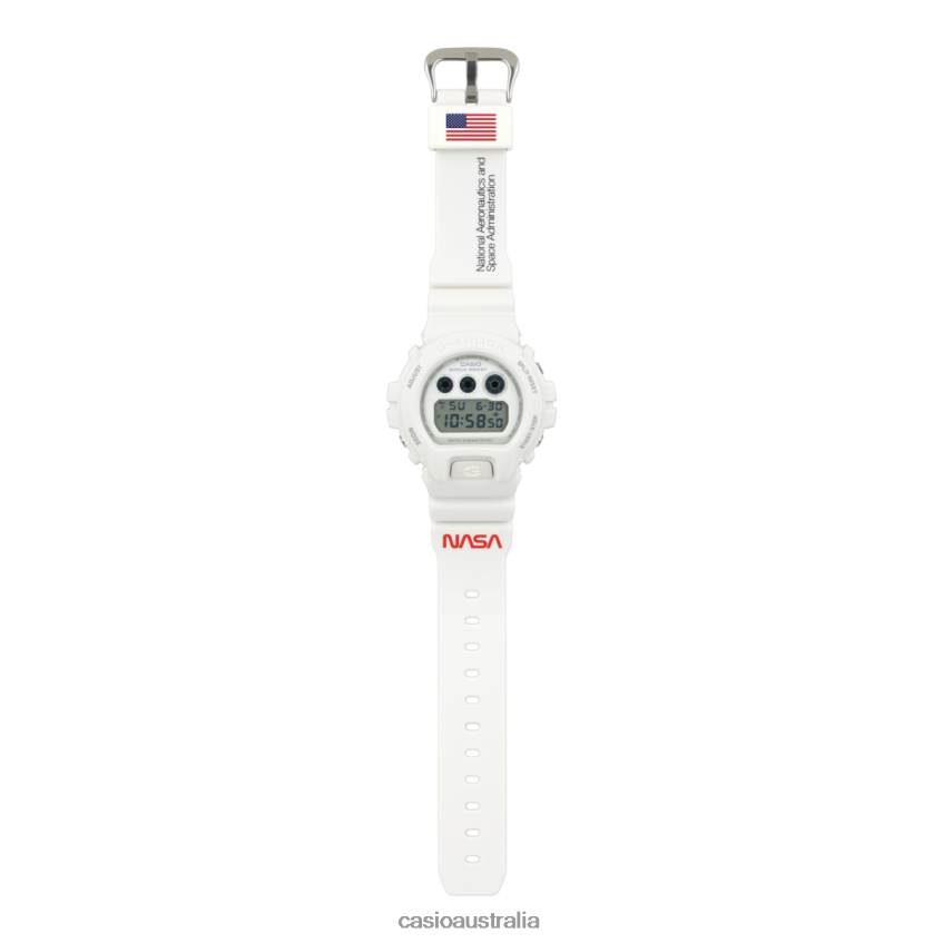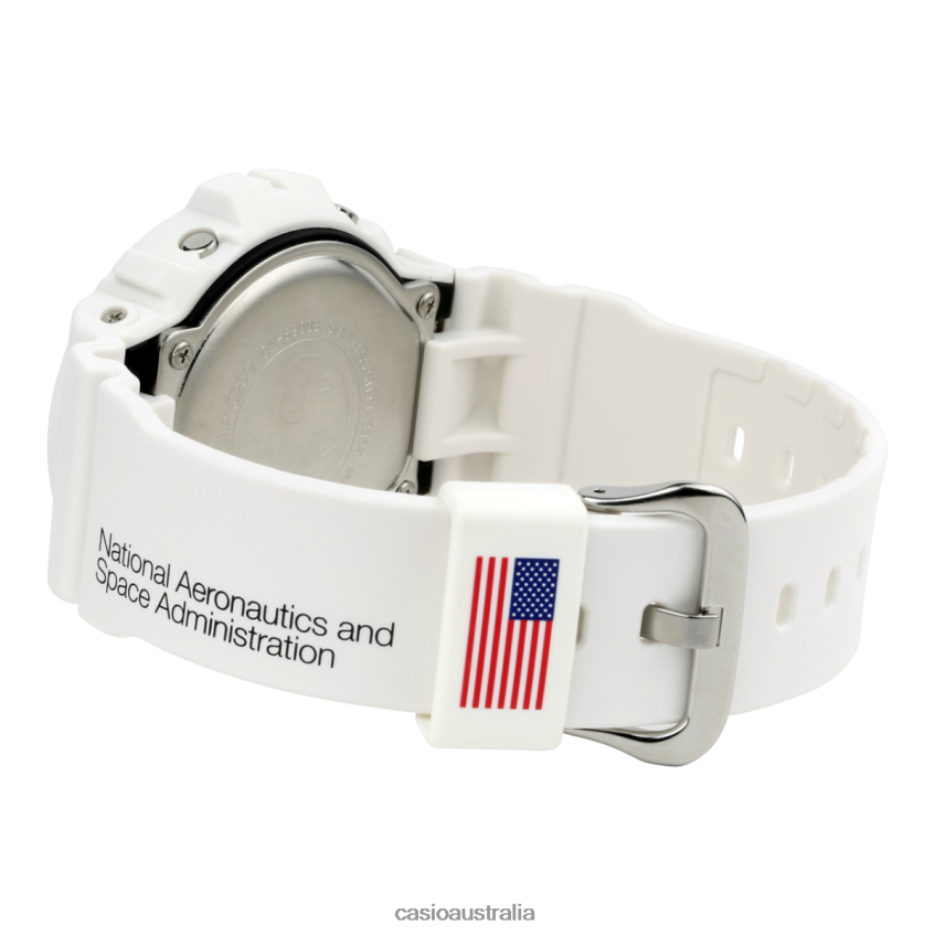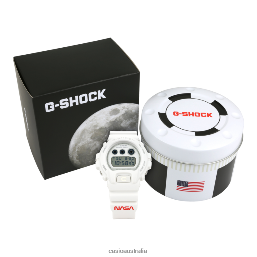 The DW6900NASA237 is the fourth timepiece paying homage to the National Aeronautics and Space Administration (NASA) and the desire for the moon and beyond. This the latest rendition of the branded timepiece in the series, reminding us that whether we look up or down, two of our favorite silhouettes are close at hand. The DW6900NASA237 comes to life through the classic and timeless design of the rounded DW6900, which was first introduced in 1995 and has gone on to become a cultural icon with era-spanning popularity. In celebration of its 40th anniversary, G-SHOCK unites fans of both brands and pays homage to a beloved and influential style, inviting enthusiasts to come together and revel in the distinctive aura of this new timepiece.Sporting a crisp, matte white finish, the DW6900NASA237 features a full resin case, bezel, and band, making for a minimalistic yet bold look on the wrist. To further commemorate the brand, the timepiece displays the NASA logo on the lower band and "National Aeronautics and Space Administration" on the upper band. Additionally, an American flag can be found on the band loop and a depiction of the Earth is engraved on the case back, as well as appearing in the watch face when the EL backlight is activated. Lastly, as with many limited-edition models, the watch comes in special packaging that features an outer box with the moon set against a semi-matte black background and an inner tin of black and white, emblazoned with the American flag and the brand's logo. The iconic G-SHOCK DW6900 silhouette, is renowned for its robustness and reliability, making it the perfect companion for any adventure, whether it be earthly or extraterrestrial. The popular 6900 case creates a captivating aesthetic that encapsulates the boundless spirit of exploration, challenging the limits and infinite possibilities