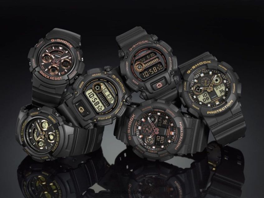 From G-SHOCK, the watch brand that is constantly setting new standards for timekeeping toughness, come new additions to the standard model lineup.The popular DW-9052, big case GA-100, and combination AW-591 start out with basic G-SHOCK black, which is then accented with brilliant rose gold and gold accents. The new gold-accented designs are really attractive additions to the G-SHOCK lineup.