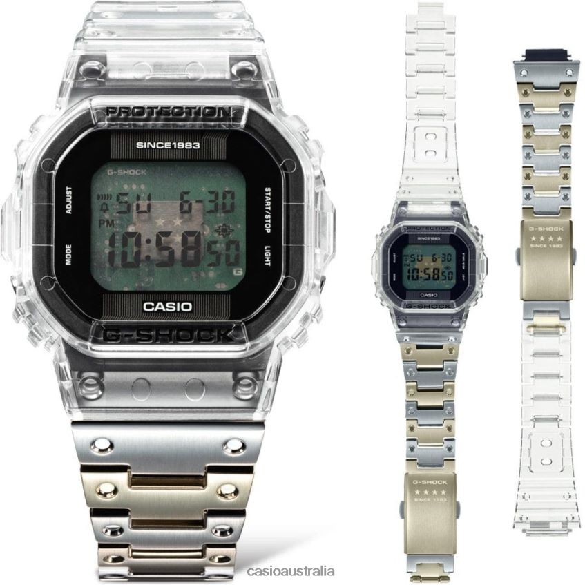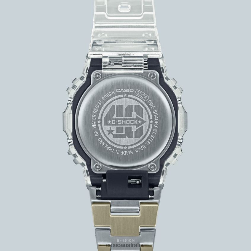 Express yourself in no uncertain terms with the G-SHOCK 40th anniversary Clear Remix lineup - popular G-SHOCK designs deconstructed with see-through components for the clearest look yet.See-through materials for the band, case, dial, LCD, and buttons provide a behind-the-scenes view of the module substrate printed with the G mark and G-SHOCK logo. The case back features the Eric Haze-designed 40th logo, and the band loop is engraved with four stars in a nod to this special anniversary. These details and the first-ever use of a see-through case made of clear glass fiber diamide deliver a singular design worthy of an exceptional limited-edition G-SHOCK. The new lineup includes watches modeled after multiple iconic G-SHOCK timepieces: the very first G-SHOCK, the DW-5000; the classic digital DW-5600; the DW-6900 with distinctive front button design; or the GA-2100/GMA-S2100 or the GA-110/GMA-S110, which can be worn on their own or as part of a matching set.See-through case: DW-6940RX, GA-114RX, GMA-S114RXSee-through dial: DW-6940RX, GA-114RX, GMA-S114RX, GA-2140RX, GMA-S2140RXSee-through LCD*: DW-5040RX, DWE-5640RX, DW-6940RXSee-through buttons: GA-114RX, GMA-S114RX*The digital display may be difficult to read at certain viewing angles due to the see-through materials used for the LCD.