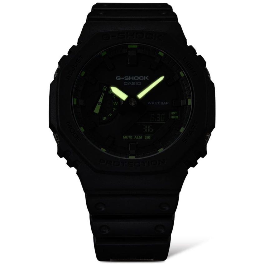 Make a splash with color set against matte black in a special design that pops with neon accents.The octagonal shape and streamlined design of the GA-2100 puts on textured matte black and vibrant neon color for a stylishly cool new look. Hour and minute hands with phosphorescent paint stay visible in the dark to keep you on your game all day and night.