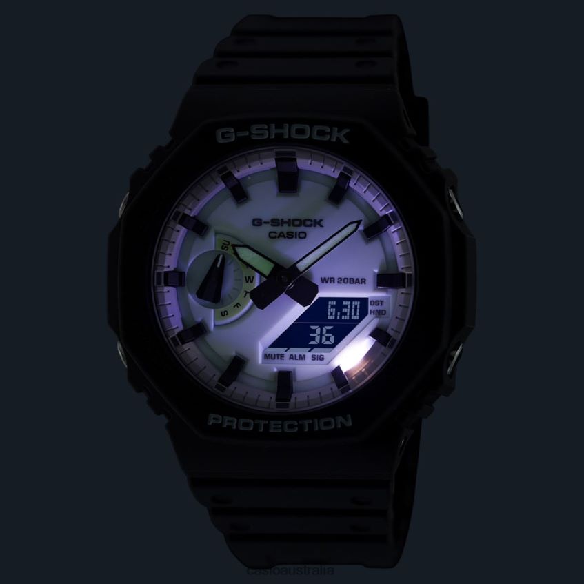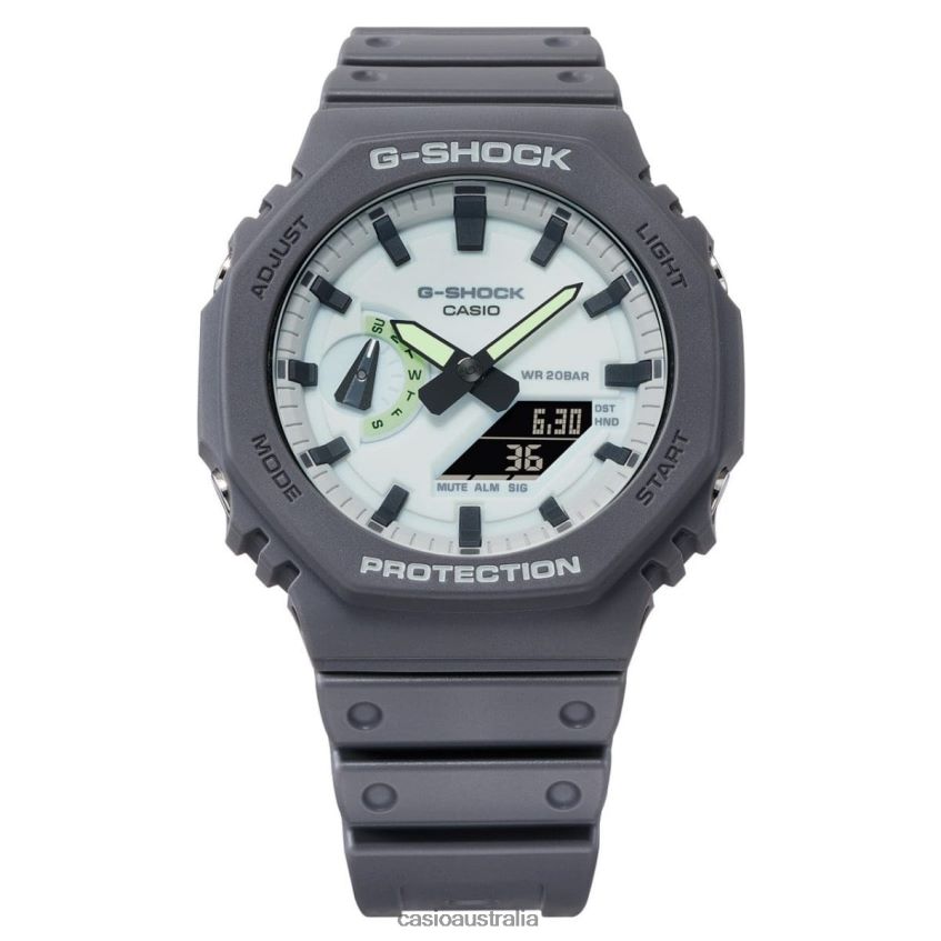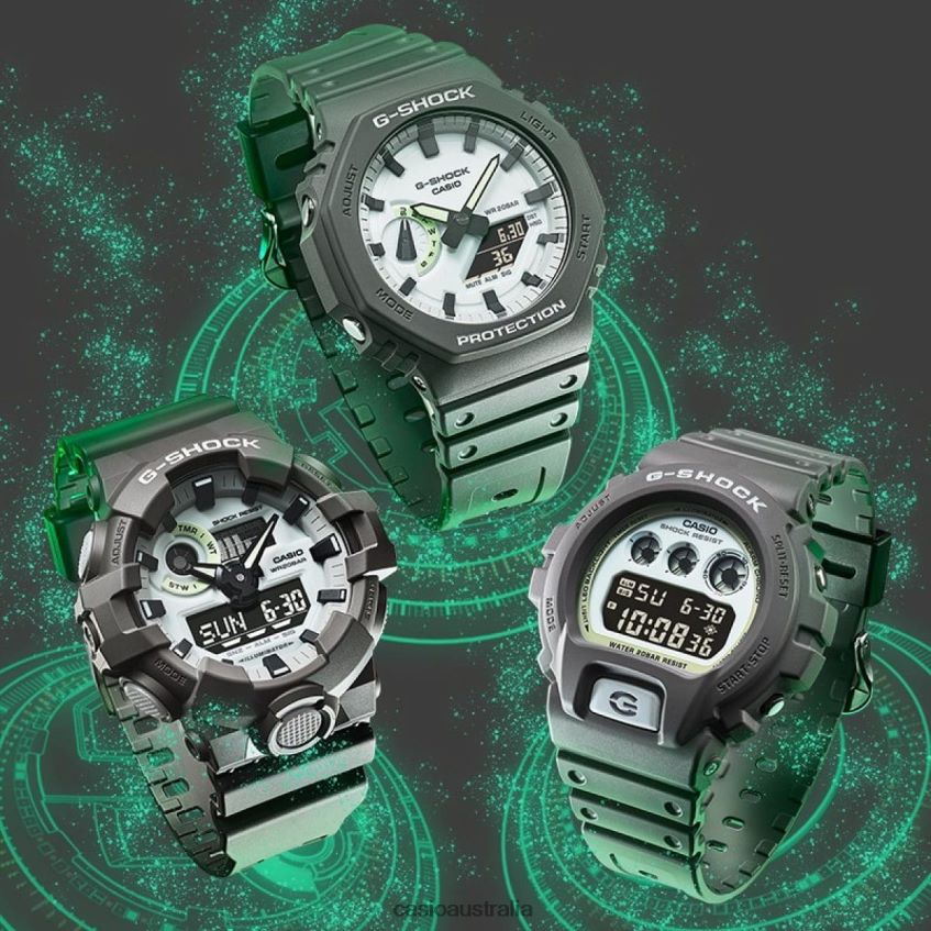 Unlock your full potential, and bring what's hidden to the fore. Introducing the G-SHOCK that glows in the dark.This line features luminescent parts set against a dark gray base - a design inspired by the hidden talents we each have, but rarely reveal.We start with a base of gray to evoke the dark, then add luminescent components and white accents to the face, creating a monochromatic watch with an extra special glow.Search out a dark space and watch this cool design come to life in glowing luminescence.