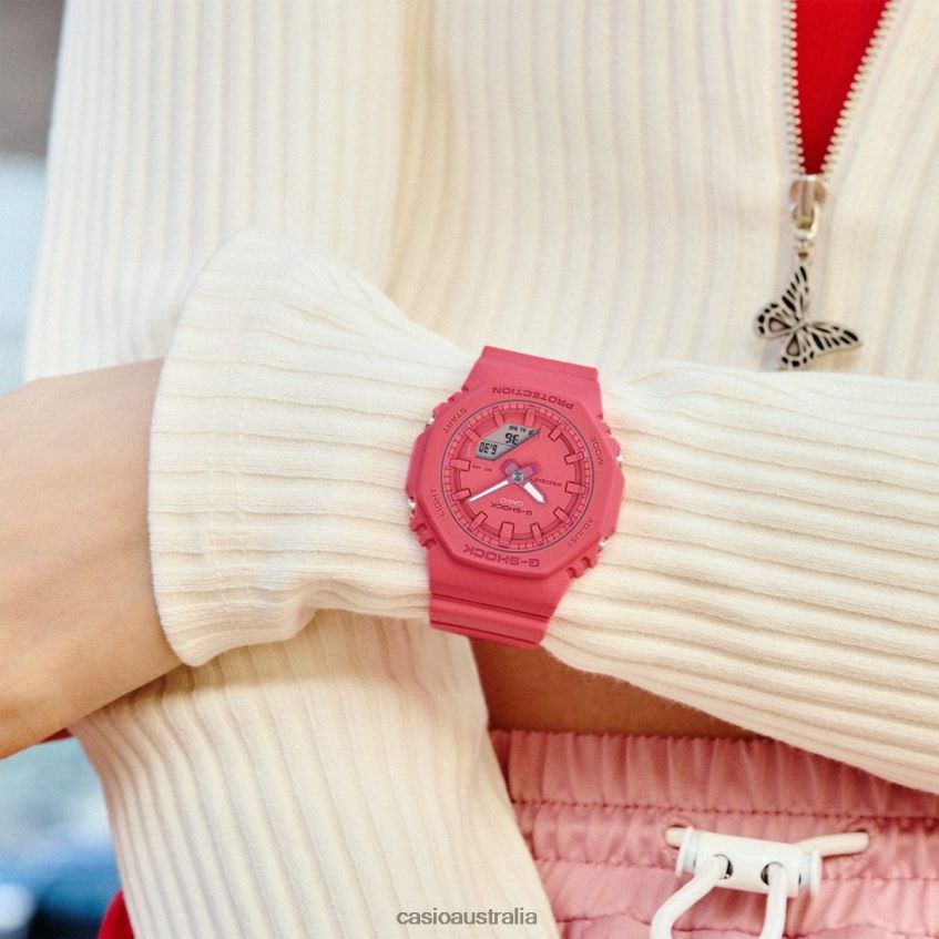 Enjoy the ever-popular digital analog G-SHOCK look with a fit more comfortable than ever.The GMAP2100 takes the already compact GMAS2100 design and makes it even slimmer and more compact, with a shorter band length, as well, to fit smaller wrists with total comfort.Monochromatic finishes in vibrant colors - dynamic turquoise blue (new color), bright pink, and classic white - lift the spirit, and the 9 o'clock inset dial from the original GMAS2100 is left behind for a streamlined, minimalist look.The stylish, yet practical watch face features a dial, logo, index marks, hands, and other components finished in different shades of the same color, simultaneously projecting sophistication and ensuring an easy read.The bezel and band of these watches are made with bio-based resin produced from renewable organic resources, a material expected to help curb CO2 emissions and otherwise reduce environmental impact.