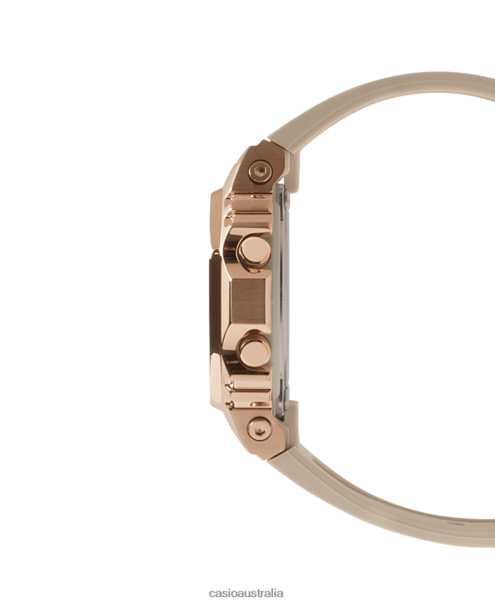 A down-sized model of the iconic 5600 series finished with luxurious metal. The square design of the GM-5600, which has been used since the first model, has been downsized to achieve a lightweight and comfortable fit. The bezel cover is made of metal with pink gold ion plating, and the band is an elegant G-SHOCK band in beige.