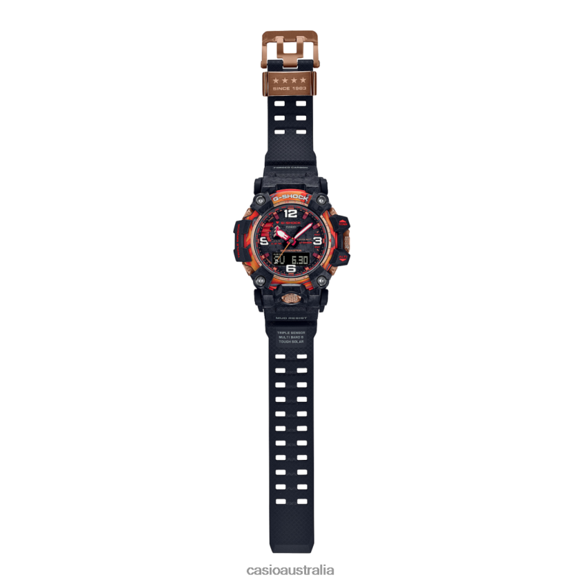 Introducing the G-SHOCK 40th Anniversary Flare Red - an eruption of fiery color in two limited-edition timepieces celebrating the 40th anniversary of the 1983 G-SHOCK debut.Inspired by the intense power of the solar flare, the MTG-B3000 and GWG-2000 both radiate G-SHOCK brand black and red, delivering the best new technologies from Casio.A multicolor carbon-insert bezel, crafted of layers of carbon and glass fiber sheets containing phosphorescent particles, evokes the massive explosive power of the sun's surface, yielding a timepiece that radiates with glow-in-the-dark beauty. Individually and uniquely patterned bezel components - no two alike - result in truly one-of-a-kind lightweight watches of rugged strength.Take it even higher with the GWG-2000 bezel components, made of forged carbon fiber with phosphorescent particles to match the bezel with solar flare patterns that glow in the dark.Both models feature a solar flare pattern printed on the dial, as well as an Eric Haze-designed logo commemorating the 40th anniversary of G-SHOCK engraved on the case back and four stars for 40 engraved on the band loop.These meticulously beautiful, uniquely impactful timepieces are just right for kicking off the G-SHOCK 40th anniversary celebration.