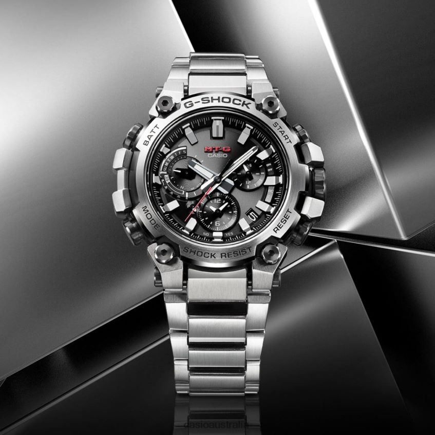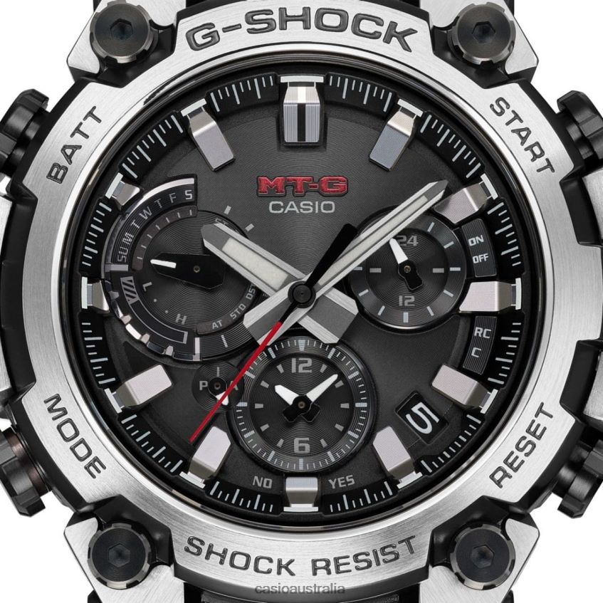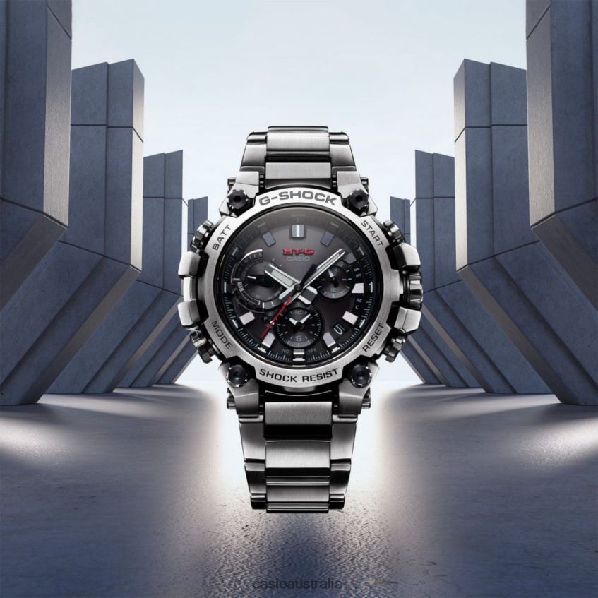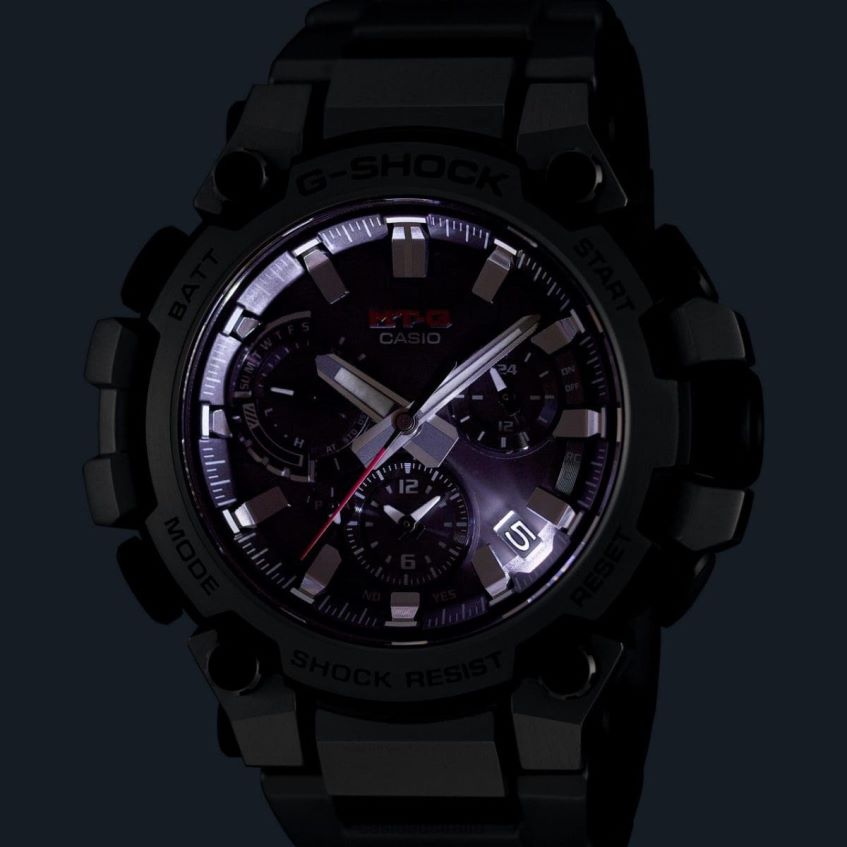 Discover innovative form of great structural beauty, MT-G timepieces born of an entirely new design concept combining the resin used in the first G-SHOCK models with metal materials. Welcome to a whole new level of sophisticated structural design.With its even more advanced Dual Core Guard structure, the MTGB3000 protects the module in a carbon-reinforced resin case and encloses the exterior in metal components. Repeated pressing, cutting, and polishing builds the stainless steel case back upward into an intricate 3D form. The case back also serves as the lugs to secure the band and as the guards for crown and buttons, for a completely new structure. Using high-density mounting technology, we developed a new slimmer, multi-function module. All of these innovative designs and technologies created a much thinner watch, measuring just 12.1 mm from bezel to case back. The MTGB3000D features an even lighter layered composite band made of stainless steel and fine resin. Its stainless steel bezel is ion plated in black, then treated with a hairline finish to expose the stainless steel below the convex surfaces only. These meticulous details come together to offer an intricate and sophisticated design.This innovative, tough new style delivers full-on functionality, as well. Download the CASIO WATCHES app to pair with your smartphone via Bluetooth . With Multi Band 6, Tough Solar charging system, and high-brightness LED light, these timepieces keep you at peak performance, whatever your adventures may bring.